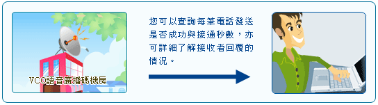 Voice Call-out語音廣播碼系統是一種電話語音訊息廣播的系統,使用者完全不需架設任何電信設備,可運用手邊的電話來錄製語音,並將所錄製的語音訊息,發送給指定的多組電話(不分市話或行動)。